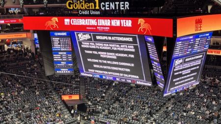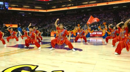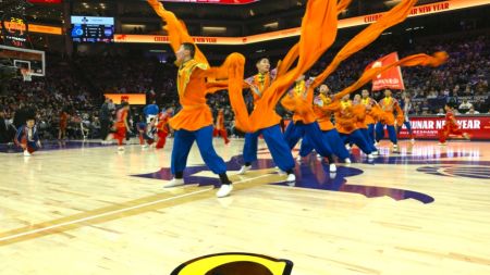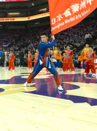 当晚,在国王队主场对阵奥兰多魔术队的比赛间隙,中华武校的健儿们如天降神兵。伴随着激昂澎湃的中国传统鼓乐,刀光剑影间尽显中华儿女的龙马精神。集体拳气势如虹,一招一式如万马奔腾;单刀进枪刚劲凌厉,展现马背民族的骁勇矫健;软功表演柔中带刚,寓意马年吉祥顺遂。