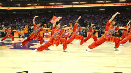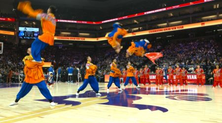 美国萨克拉门托电 当地时间2月17日,刚刚从中央广播电视总台《2026年春节联欢晚会》演播厅凯旋的山东莱州中华武校代表团,应萨克拉门托国王队特邀,在黄金1号中心闪耀登场,为现场数万名美国观众及全球收看直播的球迷献上了一场极具东方神韵的武术盛宴,共同庆祝即将到来的中国农历马年。